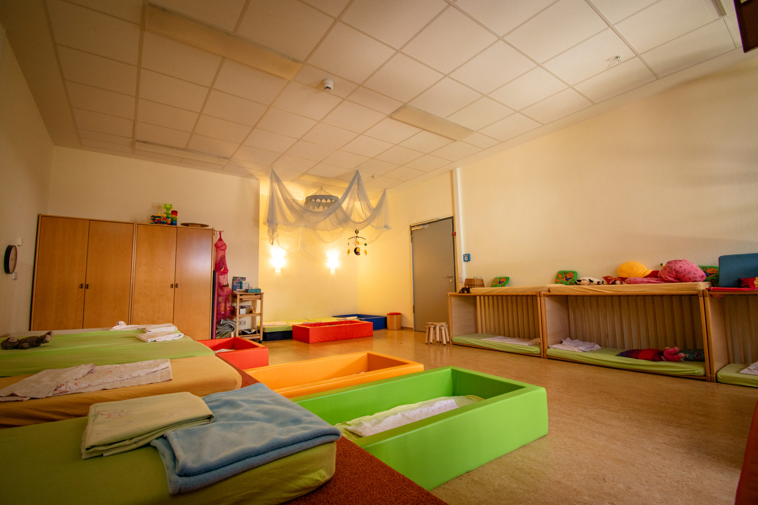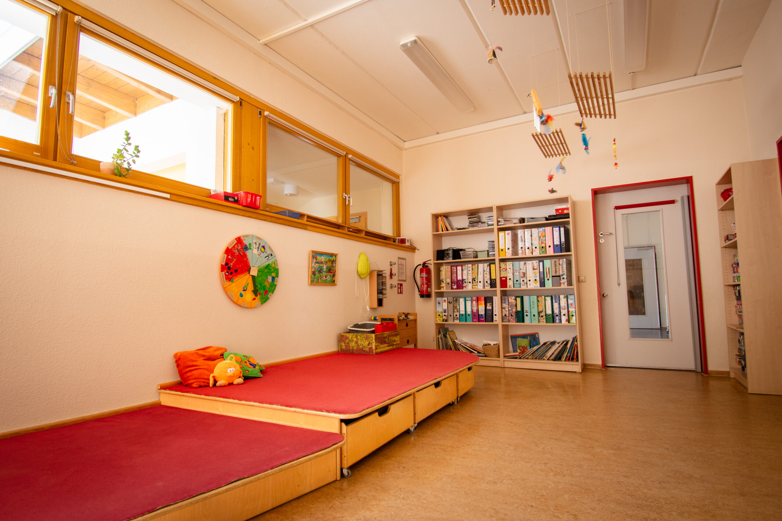 Schlafraum Im neu gestalteten Schlafraum werden die individuellen Schlafbedürfnisse der Kinder durch unterschiedliche Schlafgelegenheiten (Betten, Nestchen und Matten) berücksichtigt. Spiel- und Bildungsraum „Mäuschenzimmer“ Das Material in diesem Raum lädt zu vielfältigen kindlichen Aktivitäten ein. Im Mäuschenzimmer befinden sich eine Kinderküche sowie eine geräumige Bauecke mit unterschiedlichen Bau- und Lernmaterialien sowie vielfältige Tischspiele, die die kognitive Entwicklung der Kinder und das Zusammenspiel anregen. Kreativraum „Atelier“ Das Atelier bietet den Kindern verschiedene Möglichkeiten im Bereich der ästhetischen Bildung. Das Podest und die Hängeschaukel dienen den Kindern als Ruheinsel. Das Literaturregal regt zum Bücher anschauen an. Garderobe und Außengelände Die Garderobe hat einen direkten Zugang zum weiträumigen Garten mit Sandkasten. Linkerhand bewirtschaften die Kinder ihre eigene kleine Gärtnerei sowie einen Kompost. Auf dem gesamten Außengelände laden transportable Spielmaterialien, verschiedene Balancestrecken, Hügel und schiefe Ebenen zum ganzheitlichen Lernen ein.