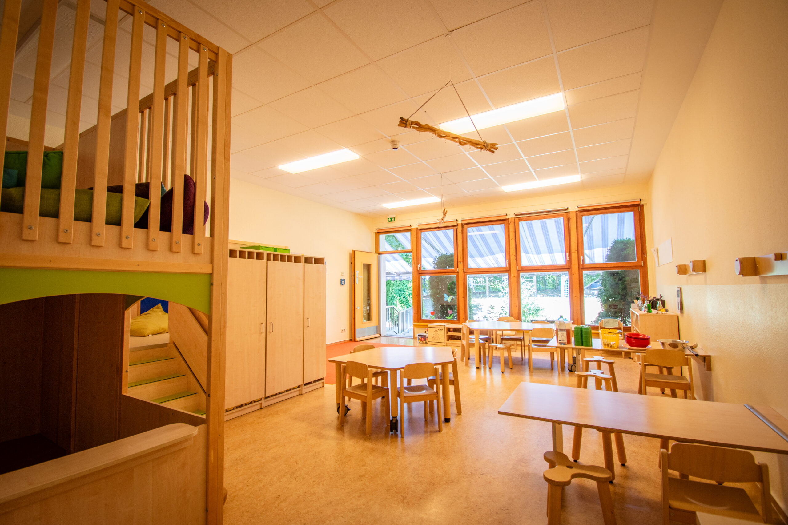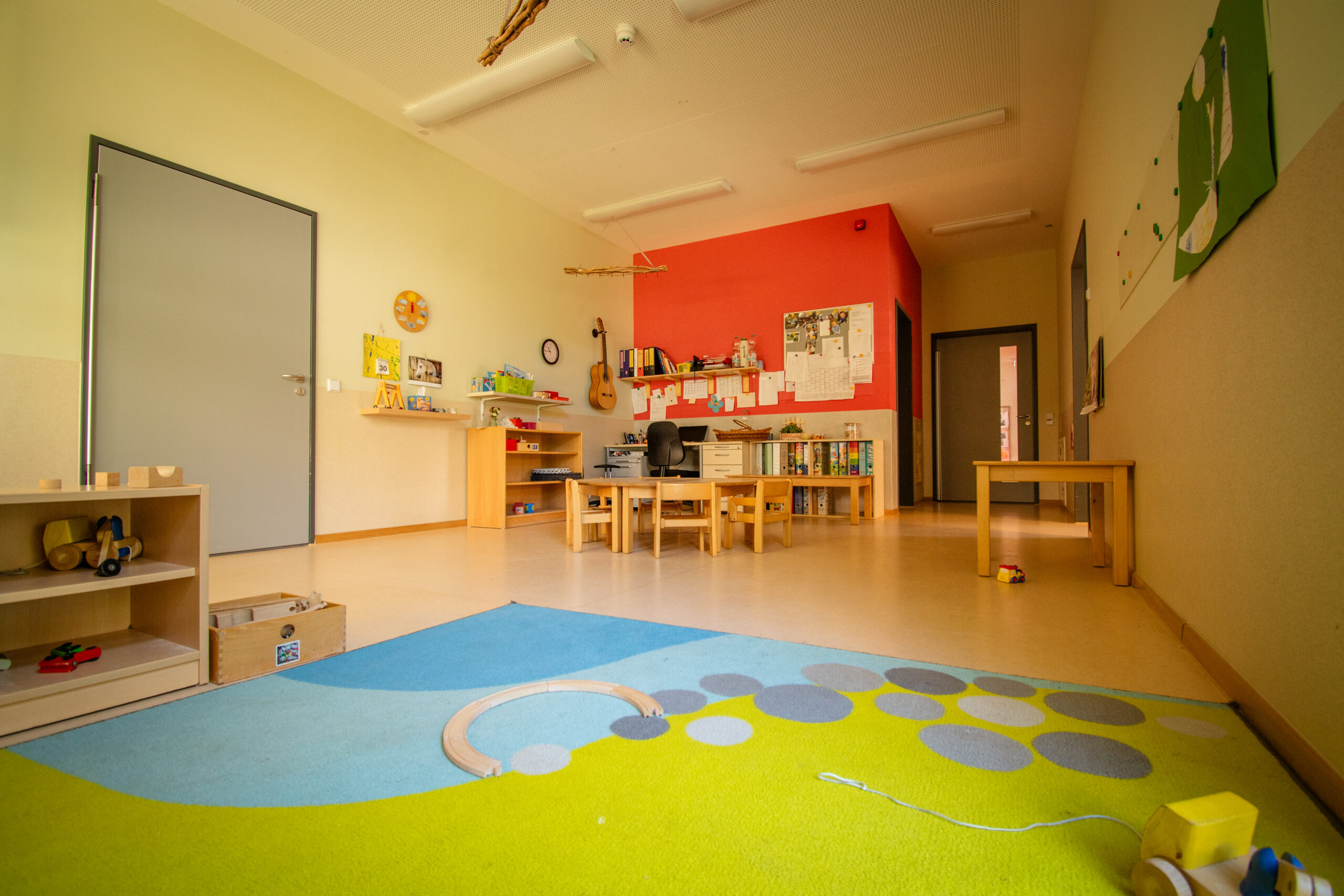 Der Kita-Komplex besteht aus einem Krippen- und einem Kindergartenbereich mit eigenen Sanitär- und Nassräumen, einem Mehrzweckraum, einem Personalraum und einem Büro sowie der Küche, der Hausmeisterwerkstatt und dem Lager.