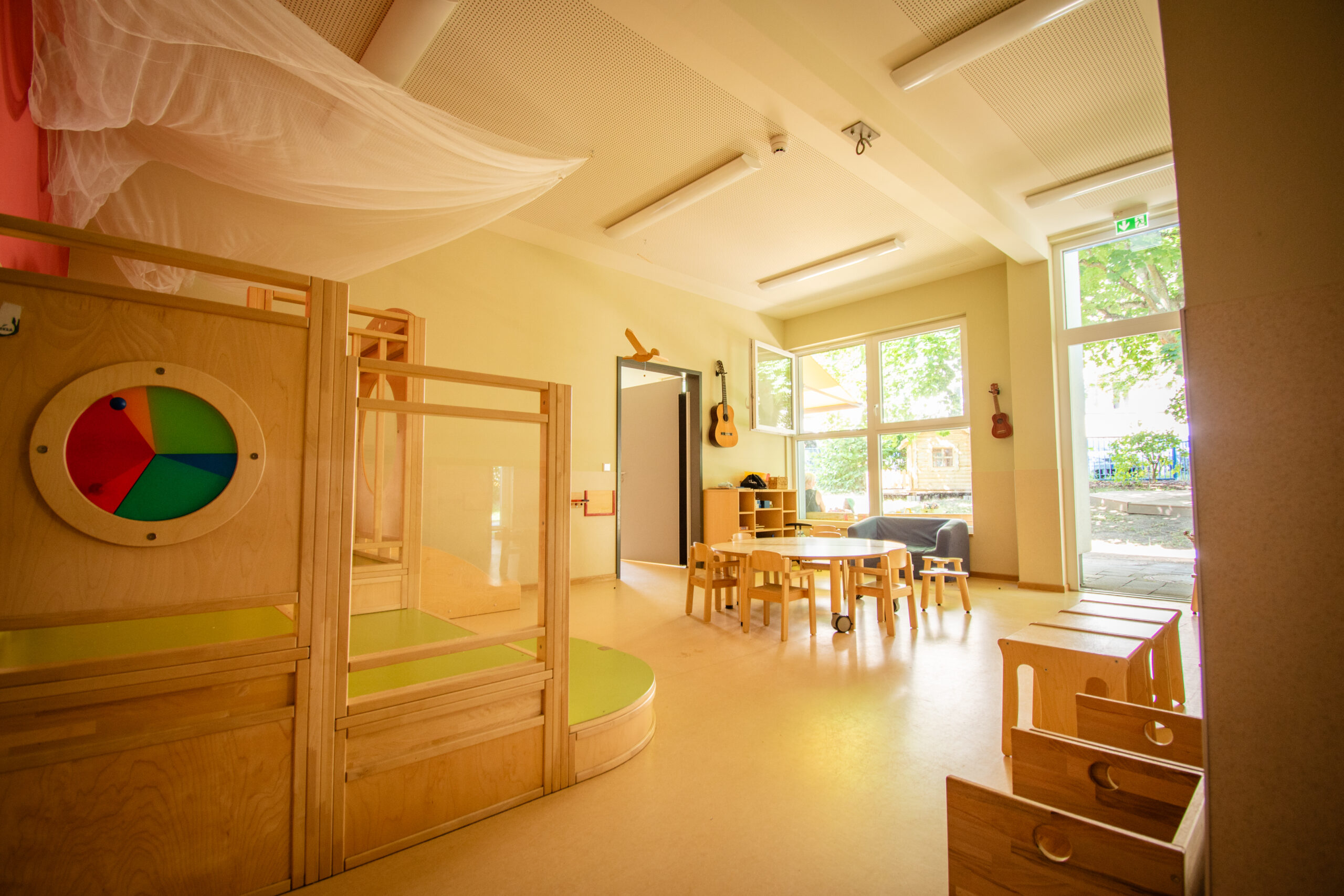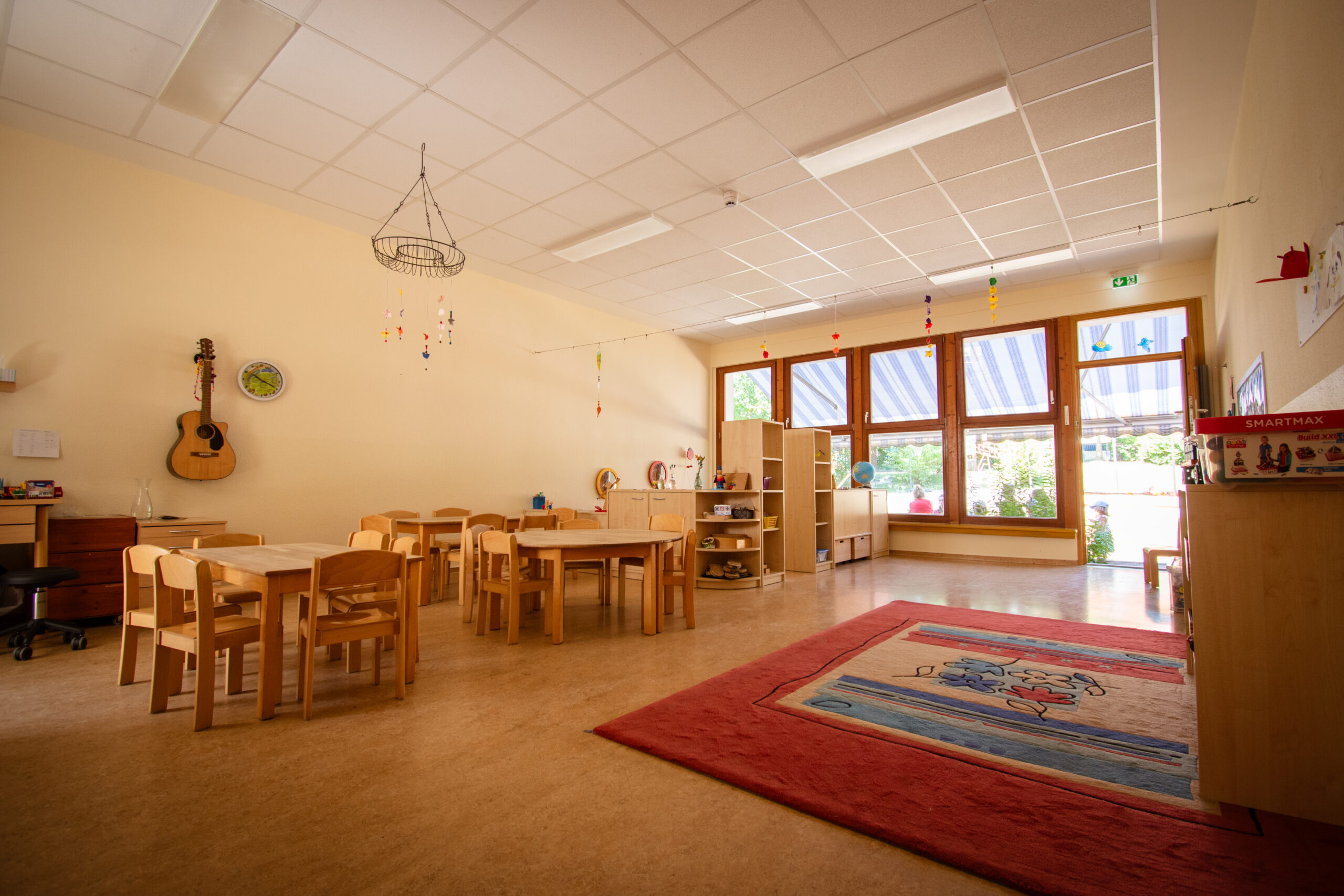 Im Mehrzweckraum finden die Kinder ein vielseitiges Angebot, das ihre Kreativität, Musikalität und Bewegungsfreude fördert. Hier entstehen Kunstwerke, es wird musiziert und getanzt. Gleichzeitig verwandelt sich der Raum bei Festen und Veranstaltungen in eine stimmungsvolle Theater- oder Märchenbühne.