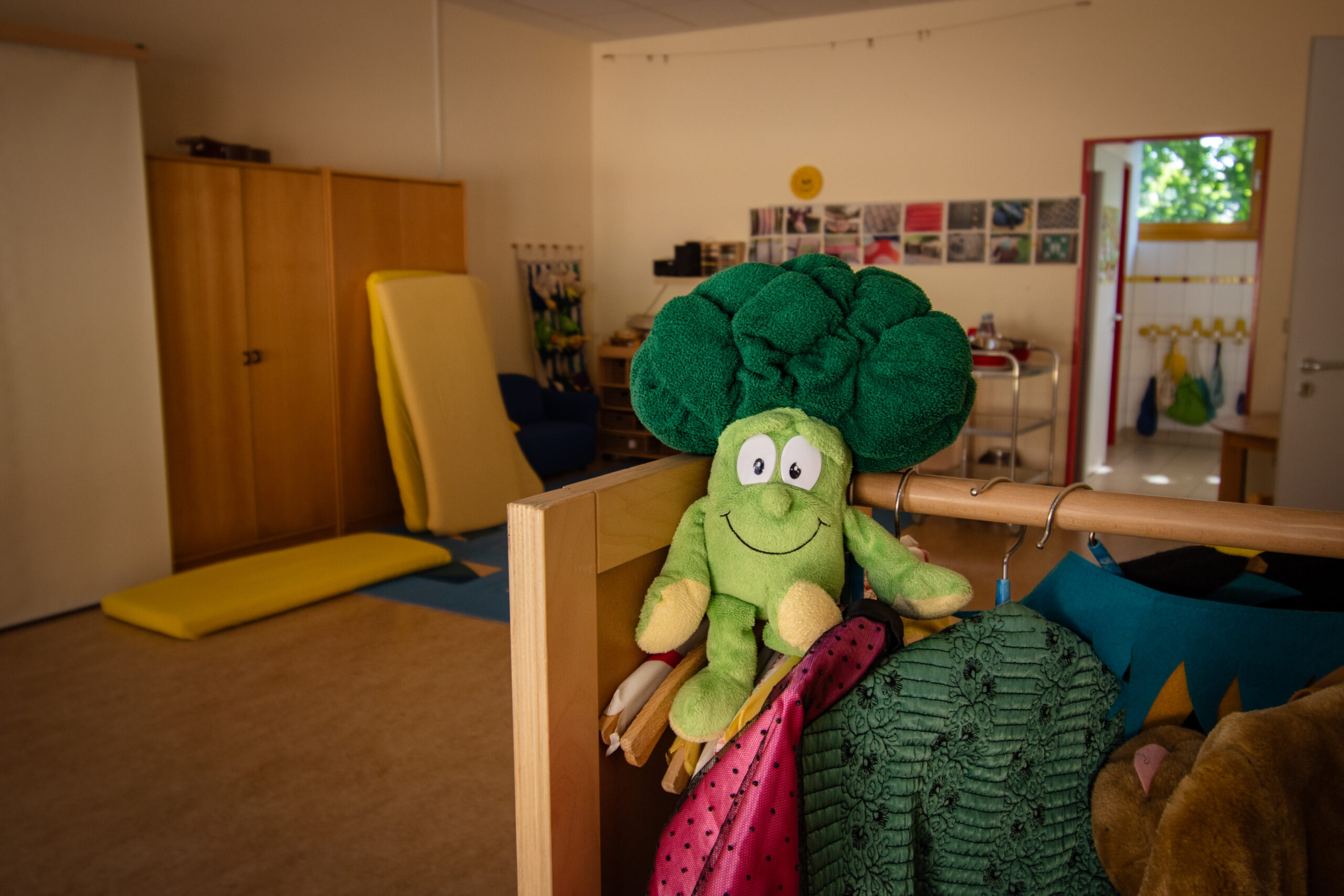 Spatzenzimmer Im Spatzenzimmer haben die Kinder Möglichkeiten sich zu verkleiden. Ein Musikwagen mit verschiedenen Instrumenten lädt außerdem zum Musizieren ein. Garderobe und Außengelände Zwei geräumige Garderoben bieten den Kindern ausreichend Platz zur Aufbewahrung ihrer persönlichen Kleidungsstücke. An jedes der drei Gruppenzimmer grenzt ein Sanitär- und Nassbereich. Igel-, Käfer- und Spatzenzimmer werden neben den beschriebenen Erfahrungsmöglichkeiten auch zum Essen und Ausruhen genutzt. Sowohl alle Gruppenräume als auch beide Garderoben bieten Zugang zur Terrasse und zum weitläufigen Garten.